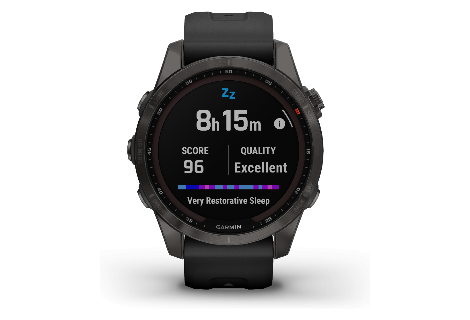 - Score de sommeil : Estimation de la qualité de votre sommeil sur une échelle de 0 à 10. Il enregistre le temps de chaque phase de sommeil en prenant en compte l’âge, le rythme cardiaque et le niveau de stress.
