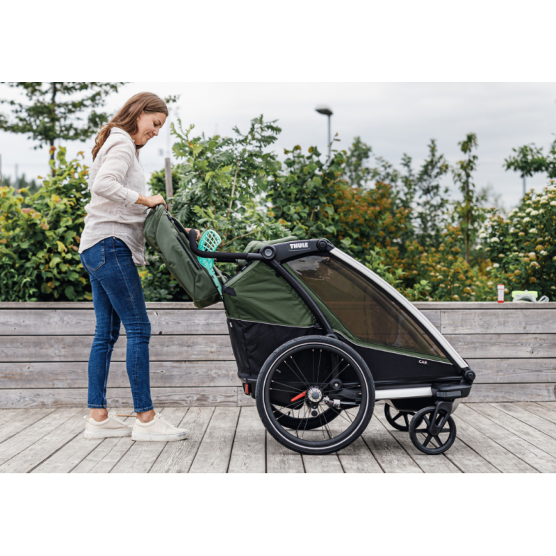 Cette remorque vélo enfant Thule Chariot Cab 2 est livrée avec un kit d’attelage pour le vélo et un kit de conversion en poussette. En mode poussette, le guidon ergonomique s’ajuste en hauteur pour s’adapter plus facilement à la taille de papa ou maman.